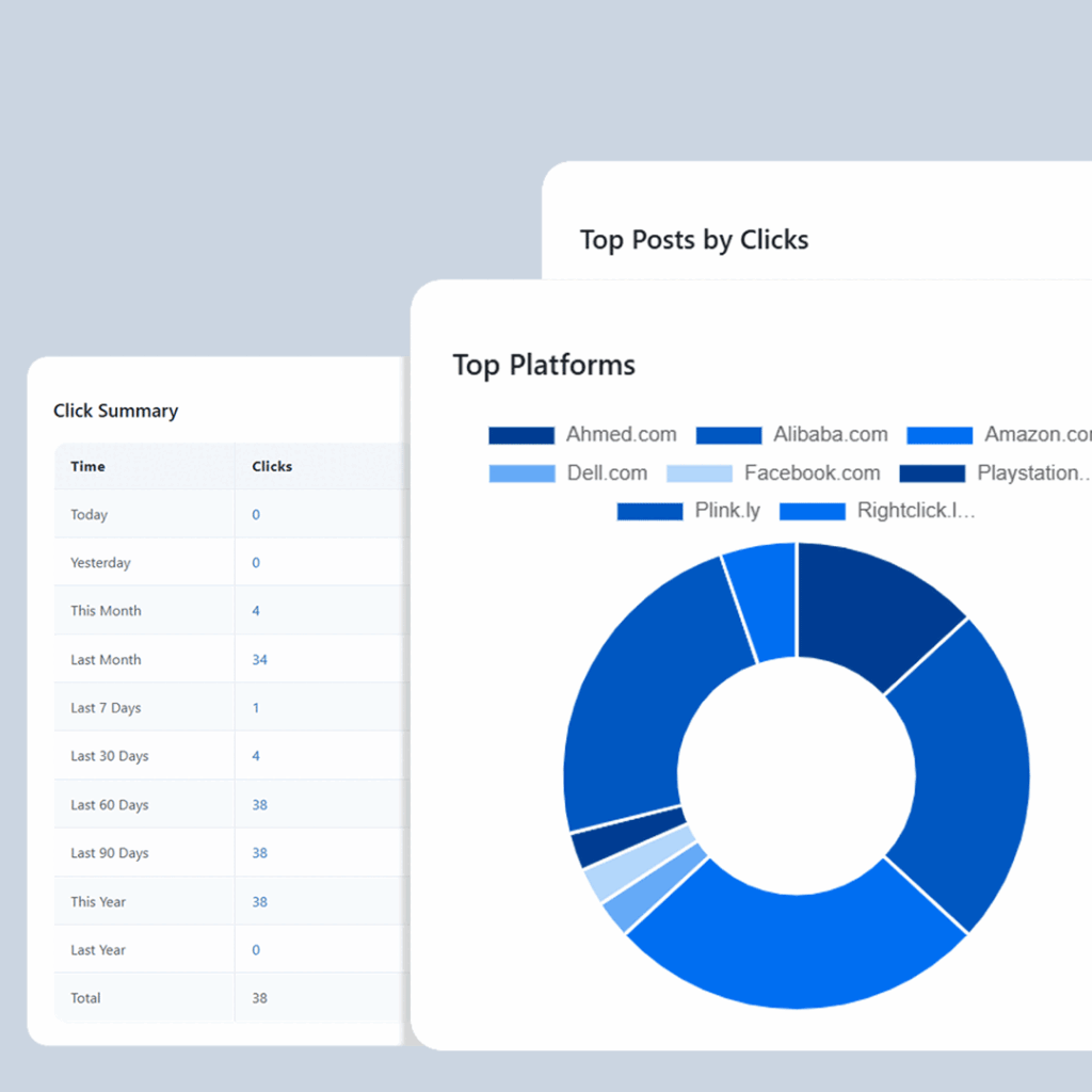 See what works at a glance. Interactive charts show your top-performing posts, buttons, and platforms — filtered by time and engagement.